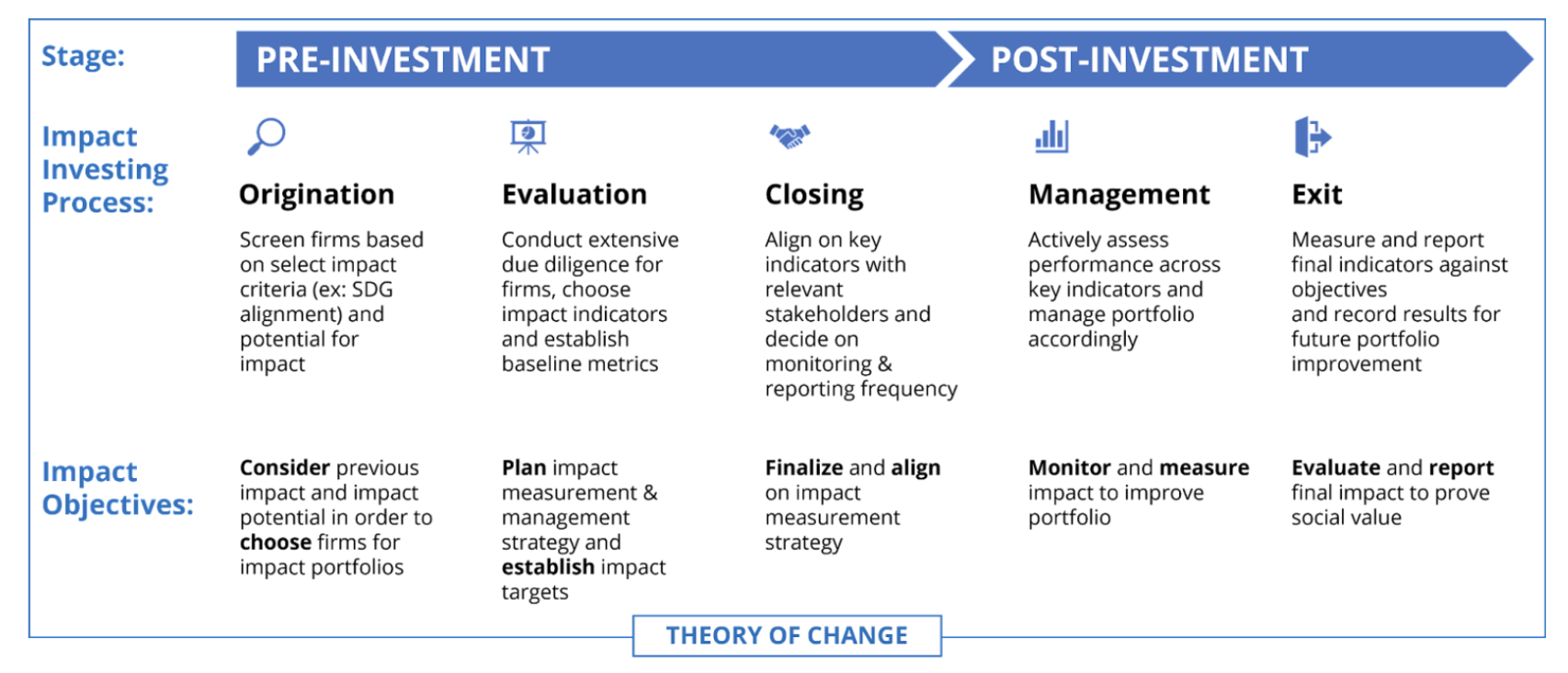 Pre-investment IMM refers to the screening and due diligence steps before investment, from origination to evaluation, in which companies’ existing impact and impact potential are assessed. This category can also include impact forecasts and planning.